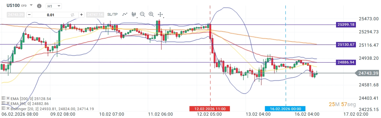 La venta masiva en las tecnológicas indias, representadas por firmas como TCS, Infosys y Wipro, ha generado un efecto directo en el sector global debido a la alta correlación de sus ADRs con el Nasdaq. Esta presión vendedora ha provocado una reacción negativa que acumula un retroceso superior al 2,5% desde el pasado 12 de febrero, situando al índice en una fase de clara debilidad. Esta caída se ha visto validada por una sobreventa notoria, manifestada en la rotura de la banda inferior de Bollinger y una divergencia prominente entre la EMA de 200 periodos y la EMA de 50 periodos, lo que refuerza el impulso bajista actual.