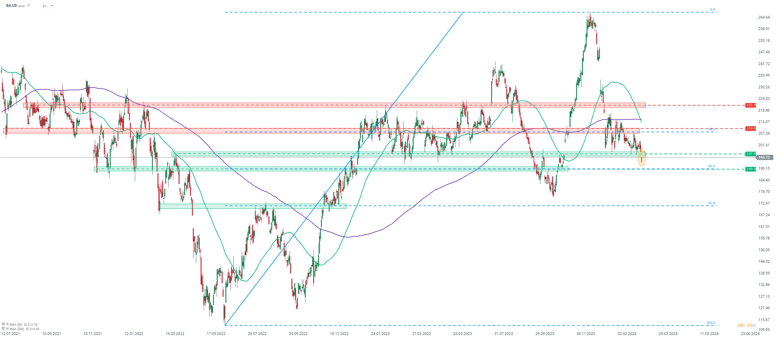 Boeing (BA.US) cotiza a la baja después de una serie de informes negativos publicados durante el fin de semana. El Wall Street Journal informó que investigadores del Departamento de Justicia se pusieron en contacto con algunos pasajeros y miembros de la tripulación de un vuelo de Alaska Air durante el cual se arrancó un panel de la puerta. Además, el secretario de Transporte de Estados Unidos, Buttigieg, dijo que la Administración Federal de Aviación de Estados Unidos evaluará rigurosamente a Boeing después del incidente. Por último, pero no menos importante, el New Zealand Herald informó que al menos 50 personas resultaron heridas después de que el Boeing 787-9 operado por Latam Airlines Group sufriera un problema técnico en el vuelo Sydney-Auckland.