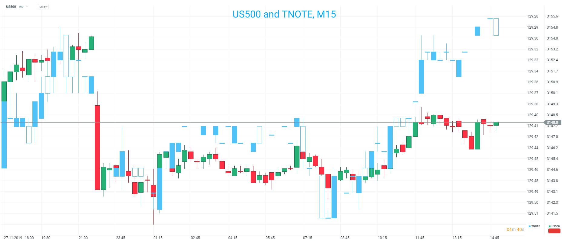 US500 y TNOTE pueden mostrar correlaciones inversas en torno a noticias relacionadas con el riesgo. Tenga en cuenta que el TNOTE (eje invertido) ha cerrado su gap y ha alcanzado nuevos mínimos durante el día, mientras que el US500 aún no lo ha hecho. Fuente: xStation