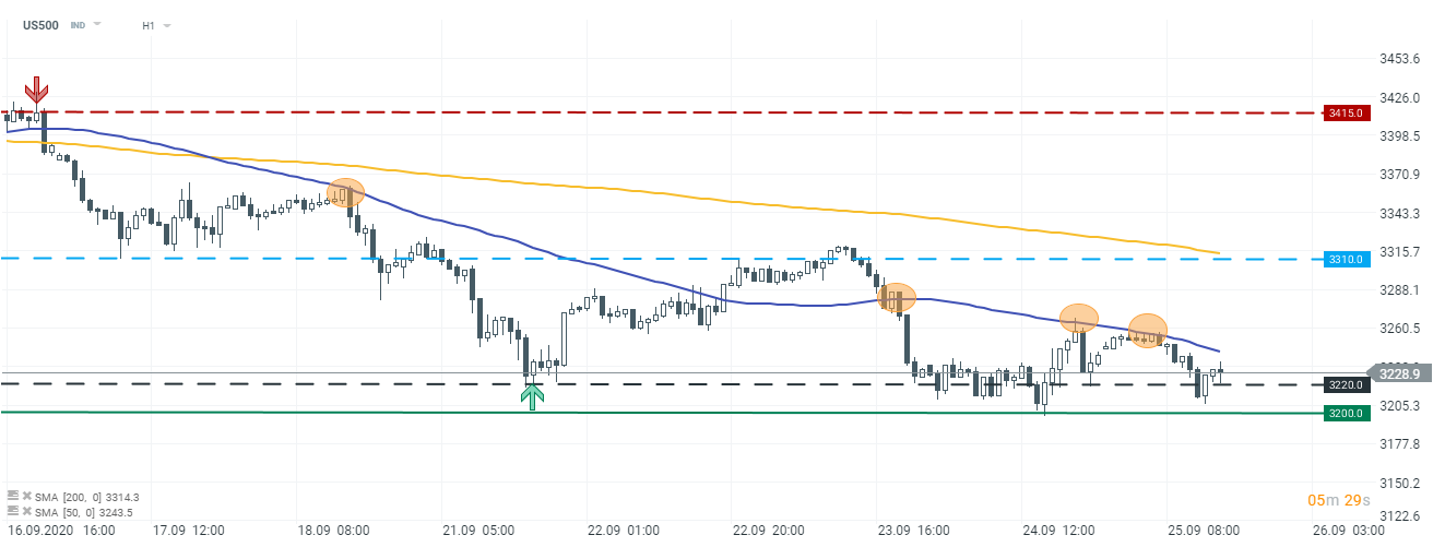 US500 ha estado intentando recuperarse antes de la apertura de EE. UU. si bien el área de 3.200 pts sirvió como soporte clave últimamente, el promedio móvil de 50 horas (línea púrpura) parece ser un nivel de resistencia a corto plazo por ahora. Tenga en cuenta que el índice no pudo superar el umbral mencionado varias veces (círculos naranjas). Sin duda, los operadores deberían prestar atención a las noticias del paquete de estímulo, ya que cualquier avance potencial puede "mover" el mercado. Fuente: xStation5