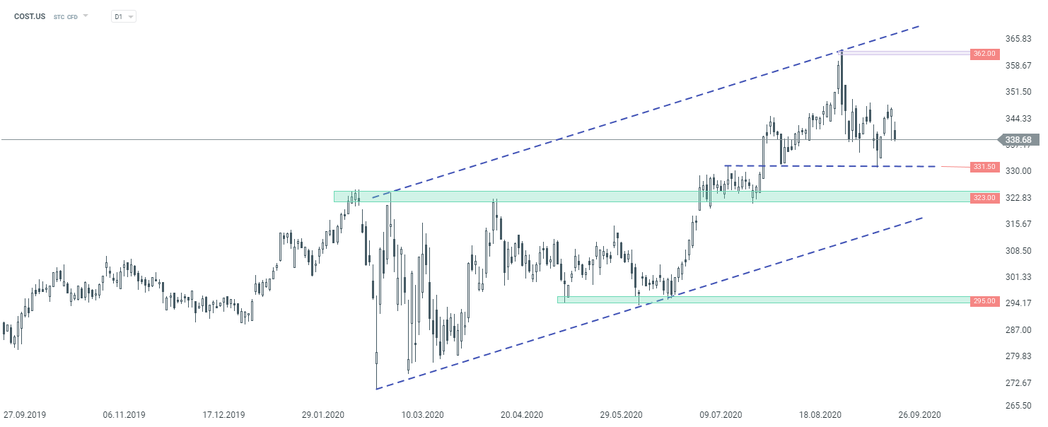 Costco Wholesale (COST.US) cotiza a la baja hoy a pesar de los resultados financieros mejores de lo esperado. Si bien el nivel de resistencia clave permanece en $ 362, los $ 331.50 pueden considerarse como la zona de soporte más cercana. Fuente: xStation5