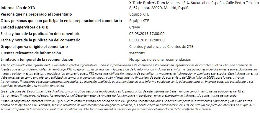 "Este informe se proporciona sólo con fines de información general y con fines educativos. Cualquier opinión, análisis, precio u otro contenido no constituyen asesoramiento de inversión o recomendación en entendimiento de la ley de Belice. El rendimiento en el pasado no indica necesariamente los resultados futuros, y cualquier persona que actúe sobre esta información lo hace bajo su propio riesgo. XTB no aceptará responsabilidad por ninguna pérdida o daño, incluida, sin limitación, cualquier pérdida de beneficio, que pueda surgir directa o indirectamente del uso o la confianza de dicha información. Los contratos por diferencias (""CFDs"") son productos con apalancamiento y acarrean un alto nivel de riesgo. Asegúrese de comprender los riesgos asociados. "