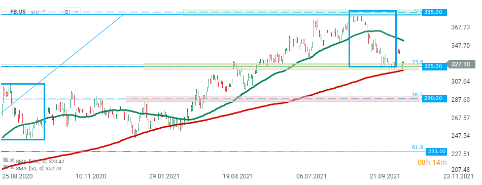 Las acciones de Facebook (FB.US) han experimentado una corrección a la baja más grande recientemente, sin embargo, los compradores lograron detener las caídas alrededor de la zona de soporte principal en $ 325.00, que coincide con el 23.6% de retroceso de Fibonacci de la onda ascendente lanzada en marzo de 2020, límite inferior del 1 : 1 estructura y 200 SMA (línea roja). Siempre que el precio se sitúe por encima de esta zona, se puede lanzar otro impulso alcista hacia un máximo histórico de 385,00 dólares. Por otro lado, si los vendedores logran romper a la baja, entonces el movimiento a la baja puede acelerarse hacia el soporte en $ 290.00. Fuente: xStation5