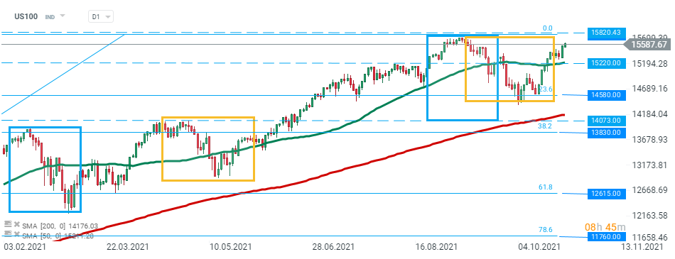 US100 abrio la sesión de hoy al alza y se acerca al máximo histórico en 15,820 pts, que coincide con el límite superior de la estructura 1: 1. Sin embargo, si los vendedores logran detener los avances, entonces se puede lanzar otro impulso a la baja hacia el soporte en 15220 pts. Fuente: xStation5