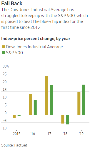 El DJIA ha superado al S&P500 en cada uno de los últimos 4 años, pero hasta ahora en 2019 se está quedando atrás. Fuente: FactSet