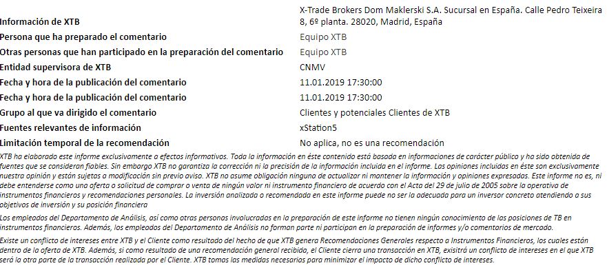 "Este informe se proporciona sólo con fines de información general y con fines educativos. Cualquier opinión, análisis, precio u otro contenido no constituyen asesoramiento de inversión o recomendación en entendimiento de la ley de Belice. El rendimiento en el pasado no indica necesariamente los resultados futuros, y cualquier persona que actúe sobre esta información lo hace bajo su propio riesgo. XTB no aceptará responsabilidad por ninguna pérdida o daño, incluida, sin limitación, cualquier pérdida de beneficio, que pueda surgir directa o indirectamente del uso o la confianza de dicha información. Los contratos por diferencias (""CFDs"") son productos con apalancamiento y acarrean un alto nivel de riesgo. Asegúrese de comprender los riesgos asociados. "