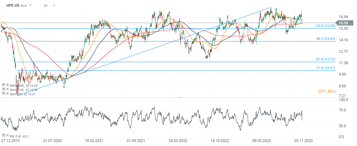 La corrección en Hewlett Packard se detuvo en el nivel SMA200 (línea roja), cerca de 16,2 dólares por acción. Una caída por debajo de 16 dólares podría indicar una prueba del retroceso de Fibonacci 38,2, a 14 dólares por acción.