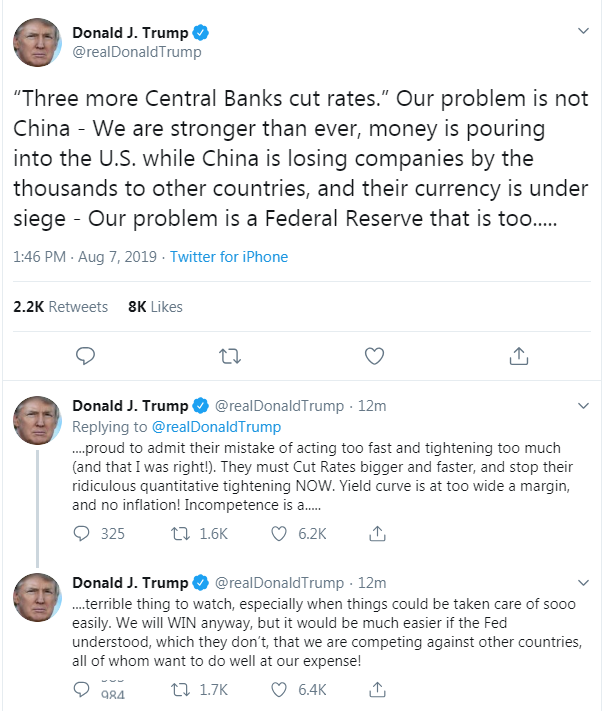 El presidente de EE. UU. una vez más recurrió a Twitter para atacar a la Fed por no reducir los tipos "más grandes y más rápidas". Fuente: xStation