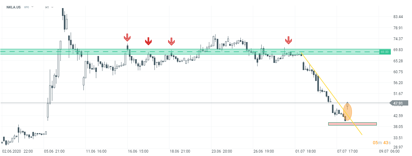 Después de fuertes subidas a principios de junio, las acciones de Nikola (NKLA.US) comenzaron a cotizar lateralmente. El área de $ 69 es una barrera donde se produjeron muchas reacciones de precios. Como las acciones cotizaban en una tendencia a la baja en los últimos días, las acciones abrieron con un gap alcista hoy. Según los analistas de JPMorgan, la compañía podría ser una buena opción para los inversores a largo plazo en medio de una serie de posibles catalizadores positivos en el futuro. Fuente: xStation5
