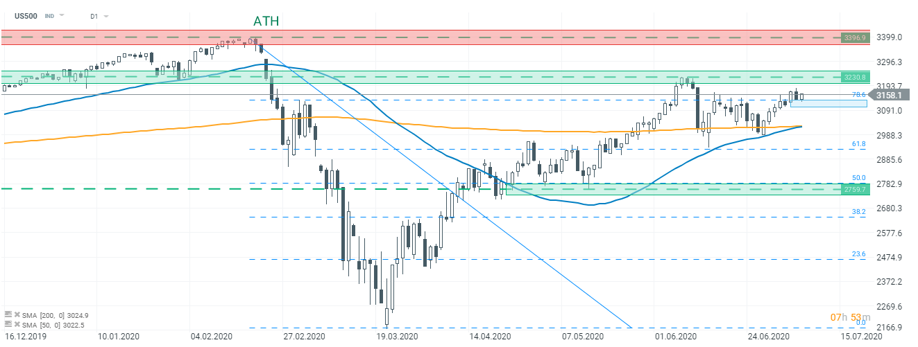 S&P 500 (US500) está en positivo hoy a pesar del pico récord de un solo día de casos de coronavirus en EE. UU. Como es habitual, las empresas tecnológicas lideran las ganancias a medida que los inversores se apresuran a comprar FANGMAN en particular (que significa: Facebook, Amazon, Netflix, Google , Microsoft, Apple, Nvidia). US500 logró recuperarse del retroceso de Fibo del 78,6% de la venta masiva de febrero a marzo. Fuente: xStation5