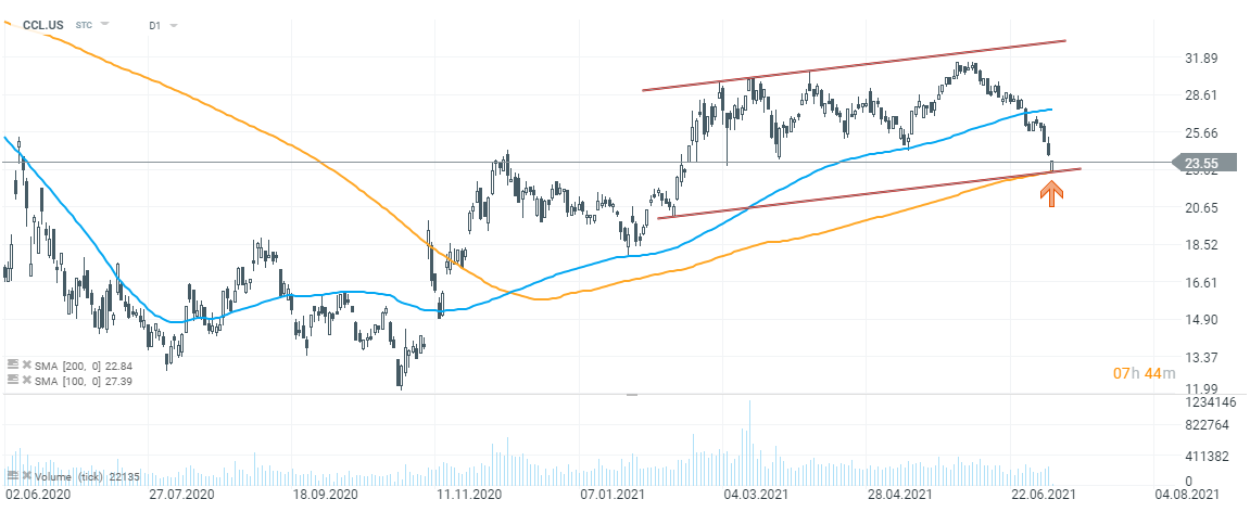 Las acciones de Carnival (CCL.US) todavía cotizan muy por debajo de sus niveles pre-pandémicos. Además, el precio está bajo presión en medio de los temores de la variante Delta. CCL.US cayó del acantilado después de que se deslizó por debajo del promedio móvil de 100 días (línea azul). El precio intenta recuperarse después de alcanzar la media móvil de 200 días (línea naranja). Fuente: xStation5