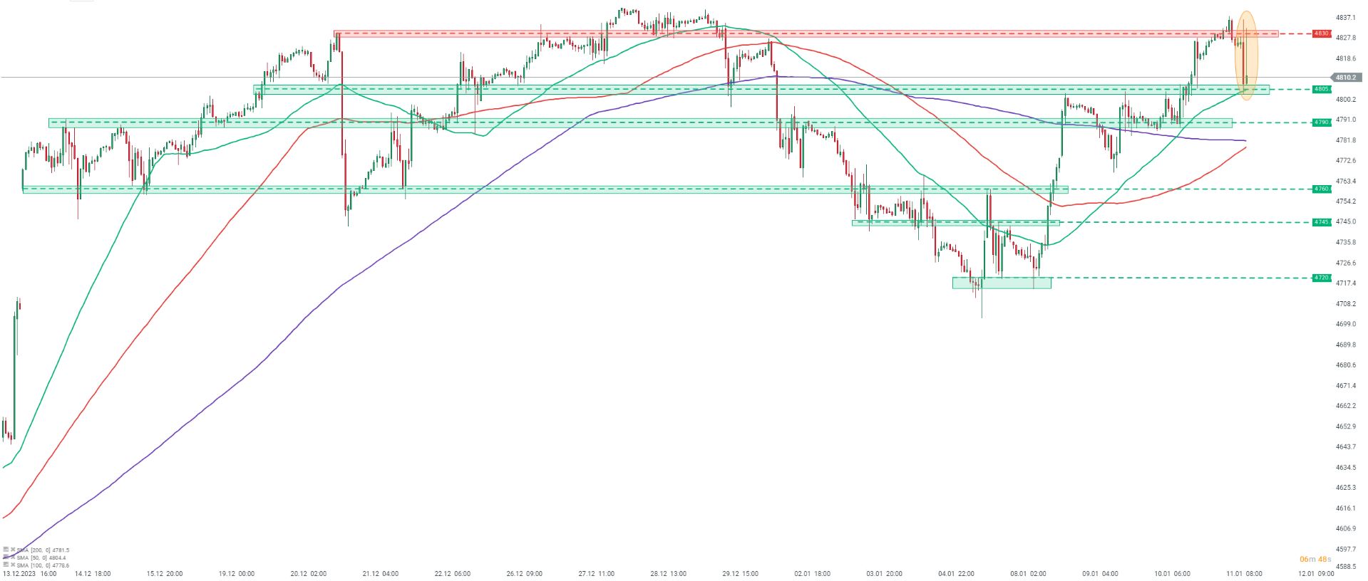 Los futuros del S&P 500 (US500) retrocedieron desde la zona de resistencia de 4.830 pts, tras la publicación de datos de inflación "halcones". La caída se detuvo en la zona de soporte de 4.805 pts, marcada con el promedio móvil de 50 sesiones, y el índice comenzó a recuperarse posteriormente. Se realizó otra prueba del área de 4,830 pts, pero los compradores no lograron impulsar el precio por encima y el US500 comenzó a retroceder, luego del inicio de la sesión de efectivo en EE.UU. Los dos niveles antes mencionados (soporte de 4,805 pts y resistencia de 4,830 pts) son áreas clave a observar hoy.