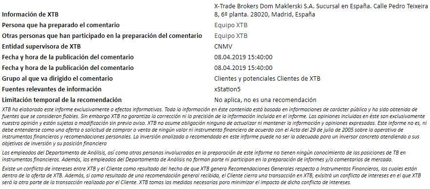 "Este informe se proporciona sólo con fines de información general y con fines educativos. Cualquier opinión, análisis, precio u otro contenido no constituyen asesoramiento de inversión o recomendación en entendimiento de la ley de Belice. El rendimiento en el pasado no indica necesariamente los resultados futuros, y cualquier persona que actúe sobre esta información lo hace bajo su propio riesgo. XTB no aceptará responsabilidad por ninguna pérdida o daño, incluida, sin limitación, cualquier pérdida de beneficio, que pueda surgir directa o indirectamente del uso o la confianza de dicha información. Los contratos por diferencias (""CFDs"") son productos con apalancamiento y acarrean un alto nivel de riesgo. Asegúrese de comprender los riesgos asociados. "