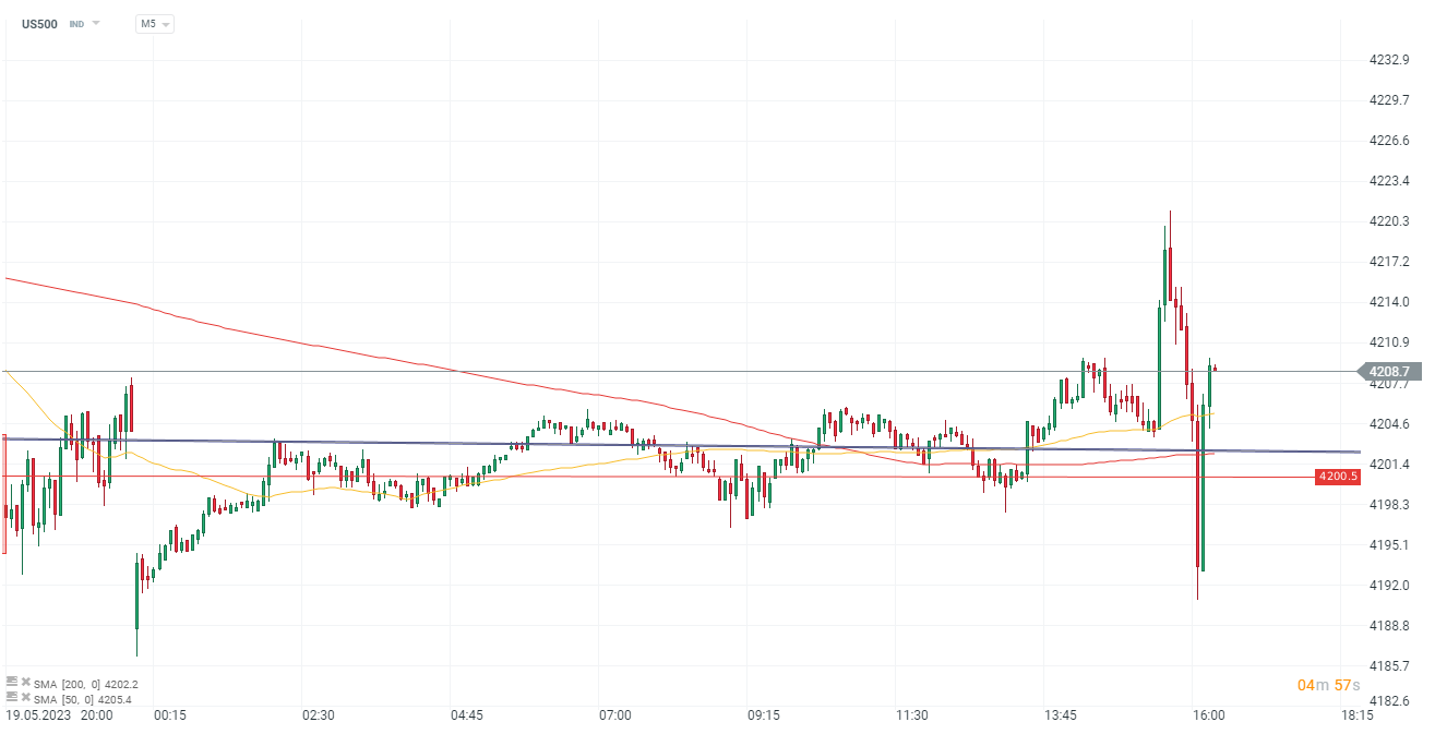 El índice US500 se cotiza actualmente en 4208 puntos, manteniéndose por debajo de un nivel de resistencia significativo ubicado alrededor de los 4220 puntos. Hoy, el precio experimentó un movimiento descendente sustancial, seguido de un rebote ascendente, influenciado por noticias falsas sobre la explosión del Pentágono, que luego fue desacreditada cuando se eliminó el tweet. Si el índice logra romper por encima del nivel de resistencia en 4220 puntos, podría desencadenar un mayor impulso alcista, superando la resistencia. Sin embargo, el hecho de no superar este nivel puede generar una presión a la baja, lo que podría empujar el precio hacia el nivel de soporte en 4160 puntos. Los inversores deben monitorear de cerca la acción del precio en torno a estos niveles clave para medir la dirección futura del índice US500.