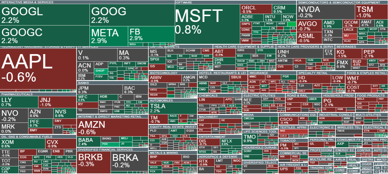 Acciones de empresas S&P 500, el volumen refleja la capitalización de mercado. Alphabet (GOOGL.US), Apple (AAPL.US) y META (META.US) están logrando alzas. Fuente: xStation 5