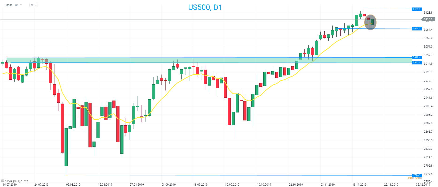 Las caídas recientes a los 3090 puntos se han comprado en el S&P500 y el mercado ha logrado mantener su increíble racha de cierres por encima de la EMA de 10 días. Ahora son 30 sesiones consecutivas que han terminado por encima de la EMA de 10 días (línea amarilla). ¿Hoy cumplirá 31 días? Fuente: xStation