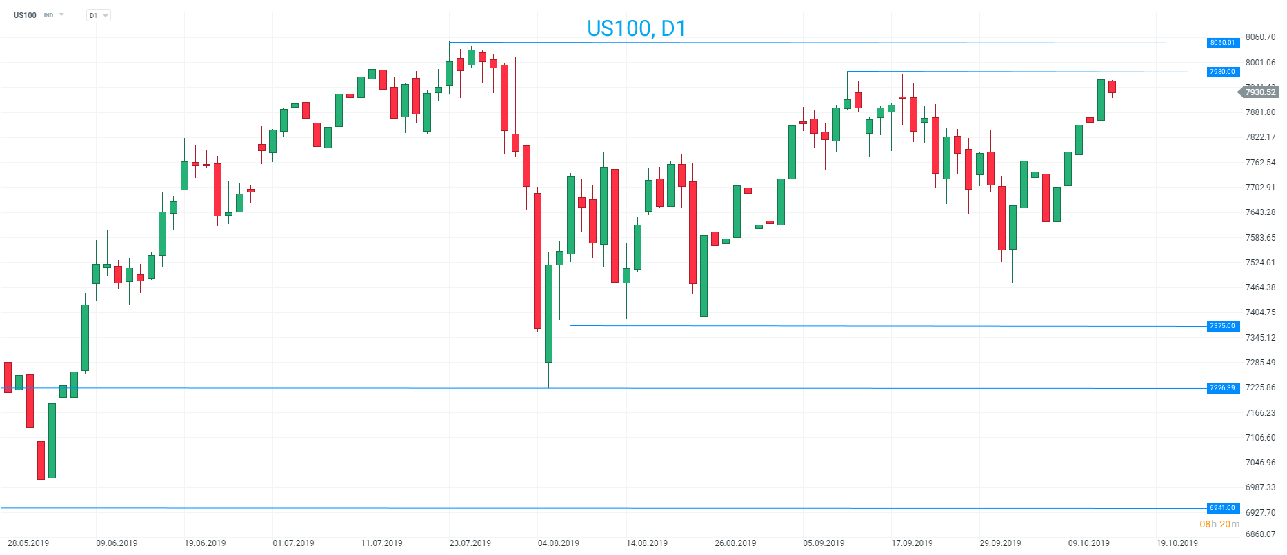 US100 ha vuelto a probar la resistencia anterior alrededor de 7980 puntos que ha atraído a los vendedores una vez más. Una ruptura por encima apuntaría a un movimiento hasta el máximo histórico de los 8050 puntos. Fuente: xStation