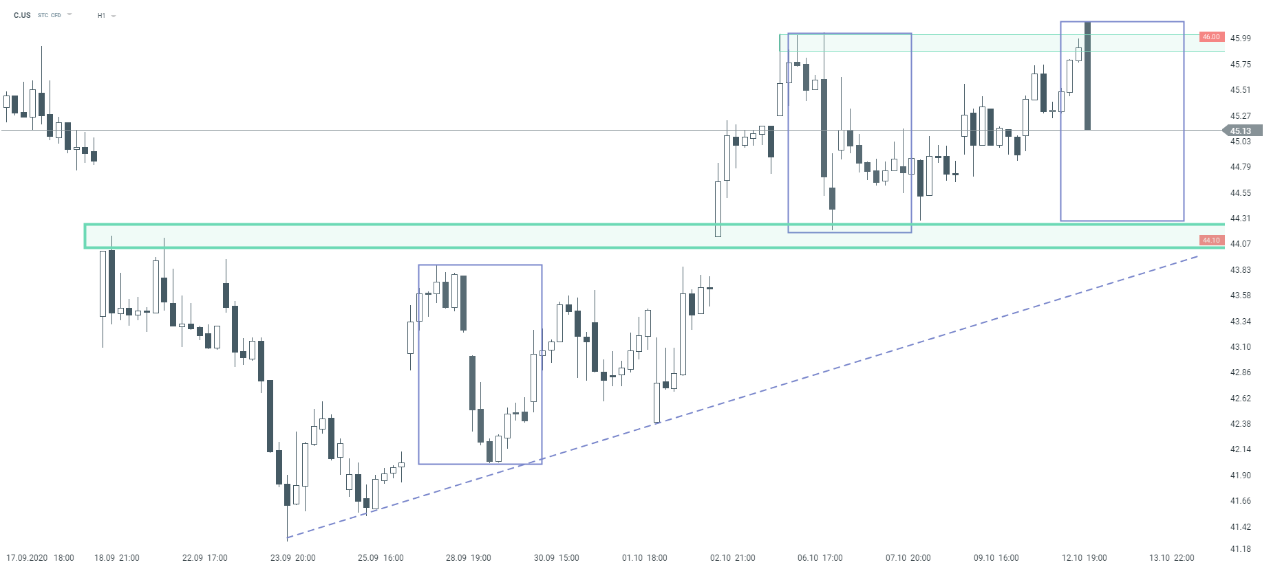 Las acciones de Citigroup (C.US) caen más del 1% a pesar de los resultados del tercer trimestre mejores de lo esperado. El área en $ 44,10 sigue siendo un nivel de soporte clave por ahora (reacciones de precios anteriores y estructura 1: 1). Fuente: xStation5