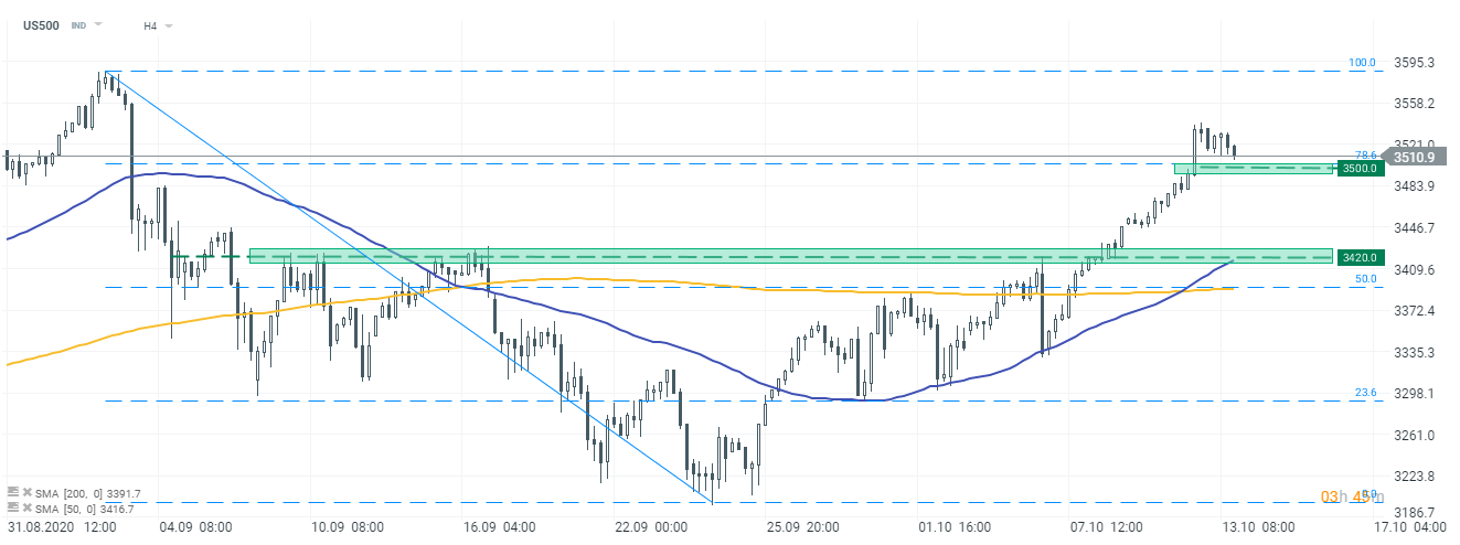 US500 parece haber perdido fuerza después de superar la marca de los 3500 pts. La barrera sigue siendo un soporte clave a corto plazo, ya que coincide con el retroceso de Fibonacci del 78,6% de la caída de septiembre. Fuente: xStation5