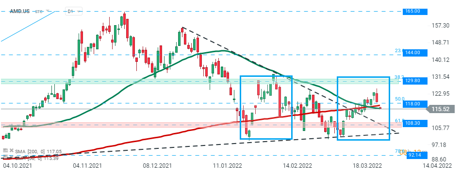 Las acciones de Advanced Micro Devices (AMD.US) iniciaron la sesión de hoy a la baja y rompieron por debajo del soporte local en $118,00, lo que coincide con un retroceso de Fibonacci del 50,0% de la ola alcista iniciada en mayo de 2021. Si prevalece el sentimiento actual, el movimiento a la baja puede acelerarse hasta $108,30. Fuente: xStation5
