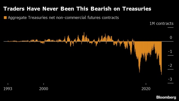 Los fondos de cobertura tienen la posición corta neta más grande en bonos del Tesoro de EE.UU. antes de la reunión de la FED, ya que esperan que los rendimientos reboten. Fuente: Bloomberg a través de Alessio Urban Twitter