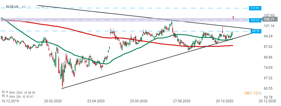 Las acciones de Dollar Tree (DLTR.US) lanzaron la sesión de hoy al alza con cifras trimestrales optimistas y pudieron superar tanto la resistencia en el nivel de $ 105.23 como el límite superior del patrón triangular. Si prevalece el sentimiento actual, entonces el movimiento alcista puede acelerarse hacia la próxima resistencia en $ 112.95. Por otro lado, romper por debajo del nivel mencionado de $ 105.23 podría desencadenar un impulso a la baja hacia el soporte en $ 98.10. Fuente: xStation5