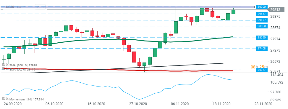 US30 extendió ganancias el martes. El índice rompió por encima de la resistencia local en 29 557 pts y está listo para probar máximos históricos. Sin embargo, el indicador de impulso muestra que el impulso alcista está disminuyendo, lo que puede significar que los compradores tendrán problemas para superar este nivel. Fuente: xStation5