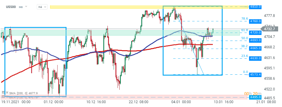 US500 abrio por encima de la resistencia local en 4720 pts, lo que coincide con el retroceso de Fibonacci del 61,8% de la última corrección a la baja. Si prevalece el sentimiento actual, el movimiento alcista puede extenderse al nivel de los 4760 pts o incluso al máximo histórico en los 4810 pts, que está marcado con el límite superior de la estructura 1:1. Fuente: xStation5