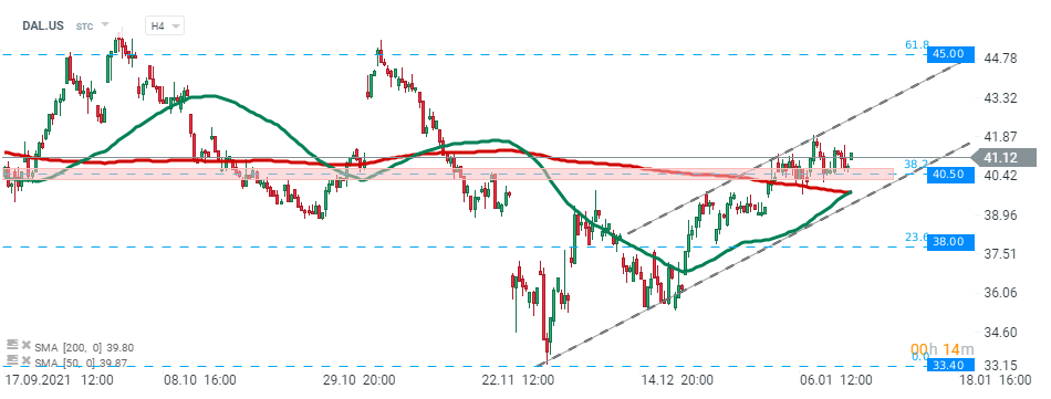 Las acciones de Delta Air Lines (DAL.US) rebotaron hasta el soporte local en los 40,50, lo que coincide con el retroceso de Fibonacci del 38,2% de la última corrección a la baja lanzada en noviembre de 2021 y se dirige hacia el límite superior del canal ascendente. En caso de que se produzca una ruptura alcista, el movimiento alcista puede acelerarse hacia la resistencia en $ 45,00, que está marcada con un retroceso del 61,8%. Por otro lado, si los vendedores logran recuperar el control y empujan el precio por debajo del soporte mencionado en $40,50 y el límite inferior del canal, entonces el movimiento a la baja puede acelerarse hacia el soporte en $38,00. Fuente: xStation5