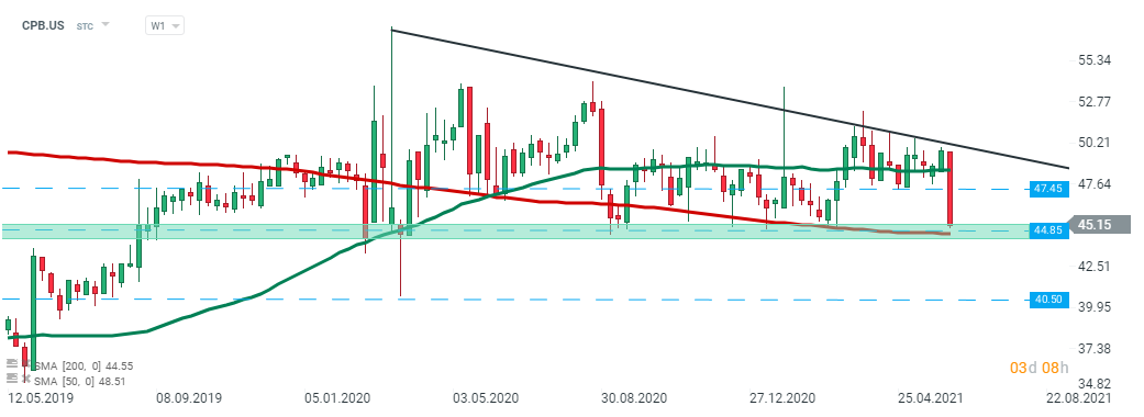 Las acciones de Campbell Soup (CPB.US) empezaron la sesión de hoy con un gap bajista y actualmente están probando un soporte importante en $ 44.85 que coincide con 200 SMA (línea roja). Si se produce una ruptura a la baja, el movimiento a la baja puede acelerarse hacia el próximo soporte en $ 40.50. Sin embargo, si los compradores logran detener las caídas aquí, la resistencia más cercana se encuentra en 47,45 dólares. Fuente: xStation5
