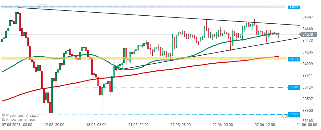 US30 se ha estado negociando dentro de una formación de triángulo cada vez más estrecha. Si se produce una ruptura por encima del límite superior, se puede lanzar otro impulso alcista hacia un máximo histórico en 35019 pts. Por otro lado, romper por debajo del límite inferior de la formación puede conducir a una mayor corrección a la baja. El primer soporte notable se encuentra en 34181 pts y se ve reforzado por 200 SMA (línea roja).