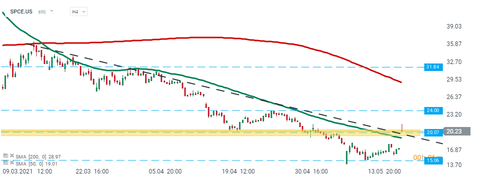 Las acciones de Virgin Galactic (SPCE.US) empezaron al alza en la sesión de hoy y se negocia por encima de la zona de resistencia principal en 20,07 dólares. Si prevalece el sentimiento actual, entonces el movimiento alcista puede extenderse a la siguiente resistencia en $ 24.00. Por otro lado, si el lanzamiento del cohete falla, entonces el soporte de $ 15.06 puede estar en riesgo. Fuente: xStation5