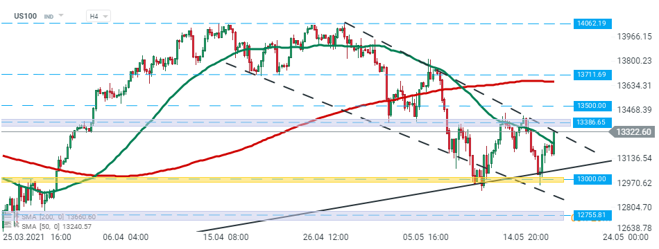 US100: los compradores han logrado detener las caídas en un soporte importante en 13055 pts ayer y se puede ver que el movimiento alcista continúa después de la apertura americana. Actualmente, el índice está probando el límite superior de la formación de cuñas. El próximo objetivo para los alcistas se ubica en 13711 pts. Por otro lado, si los vendedores logran detener los avances aquí, entonces se puede lanzar otro impulso a la baja hacia el soporte en 13000 pts. Fuente: xStation5