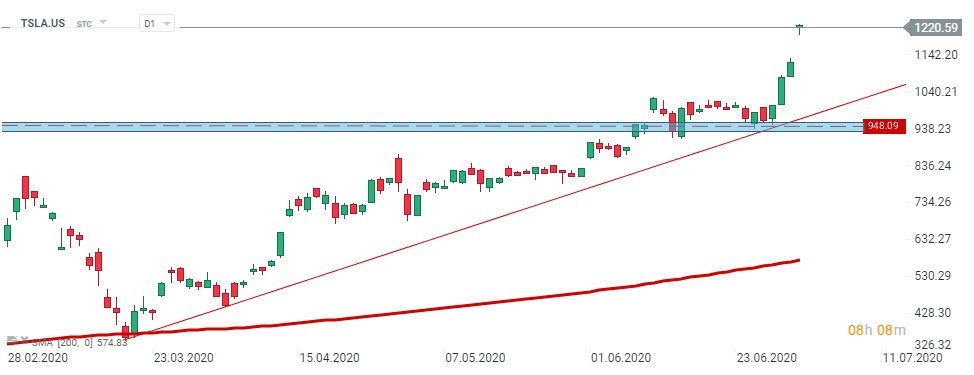 Las acciones de Tesla (TSLA.US) subieron un 9% en la preapertura y alcanzaron un nuevo máximo histórico hoy después de que el fabricante de automóviles eléctricos publicara entregas trimestrales mucho más fuertes de lo esperado. Si los vendedores logran recuperar el control, entonces se puede encontrar soporte en $ 948.09 por acción. Fuente: xStation5