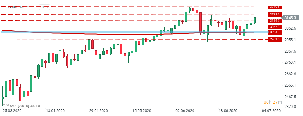 S&P500 (US500) lanzó la sesión de hoy más alta y se dirige hacia el nivel de resistencia de 3172.9 pts. Si el sentimiento del mercado cambia, entonces el soporte en 3119.7 pts puede entrar en juego. Fuente: xStation5
