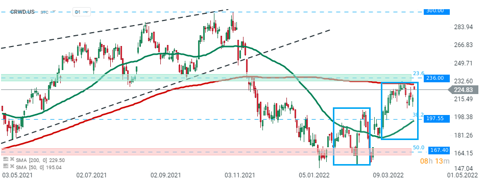 Las acciones de Crowdstrike (CRWD.US)abrierón la sesión de hoy con un gap alcista y se dirigen hacia una zona de resistencia importante alrededor de $236, que está marcada con el límite superior de la estructura 1:1, 23,6% de retroceso de Fibonacci de la onda ascendente lanzada a principios de 2020 y 200 SMA (línea roja). Sin embargo, si los vendedores logran recuperar el control, entonces el soporte más cercano para observar se encuentra en $ 197.55. Fuente: xStation5