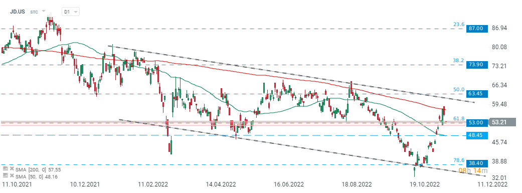 JD.com (JD.US) retrocedió bruscamente el viernes ya que los compradores no lograron superar la media simple de 200 (línea roja). Actualmente, el precio está probando un soporte importante en $53,00, que está marcado con reacciones de precios anteriores y un retroceso de Fibonacci del 61,8% de la ola alcista que comenzó en noviembre de 2018. Si se produce una ruptura a la baja, el movimiento a la baja puede profundizarse hacia la resistencia local en $48,45. Fuente: xStation5
