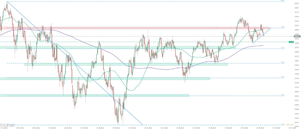 Los futuros del Dow Jones están retrocediendo hoy, junto con otros índices estadounidenses importantes. Si observamos el gráfico del Dow Jones en el intervalo D1, podemos ver que hoy el índice está rompiendo por debajo de la línea de tendencia alcista a corto plazo. Esto se produce unos días después de que el índice no lograra superar la zona de resistencia marcada con un retroceso del 78,6% del movimiento bajista iniciado a principios de 2022. Las caídas de hoy en los índices bursátiles están impulsadas por la reunión del FOMC de ayer y, más precisamente, por la postura agresiva de las proyecciones económicas. Si los bajistas mantienen el control y el índice continúa bajando, el nivel de oscilación de 34,150 pts podría ser el primer objetivo. Sin embargo, el soporte más importante se puede encontrar un 1% más bajo, con un retroceso del 61,8%.