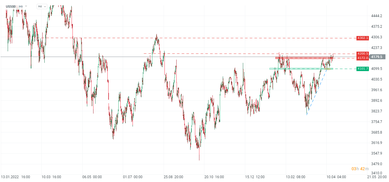 US500 rompe el rango de consolidación reciente y actualmente se cotiza cerca del nivel de resistencia de 4.200puntos. Una ruptura de esta importante zona de resistencia puede empujar el índice US500 mucho más alto. Si el impulso alcista se extiende, es posible que los inversores deseen volver a probar otra línea de resistencia significativa cerca de los 4.300 puntos puntos, nivel visto por última vez en agosto de 2022. De lo contrario, si el precio se rechaza desde $ 4200, es probable que retroceda al canal de consolidación entre 4.100puntos y 4.200 puntos.
