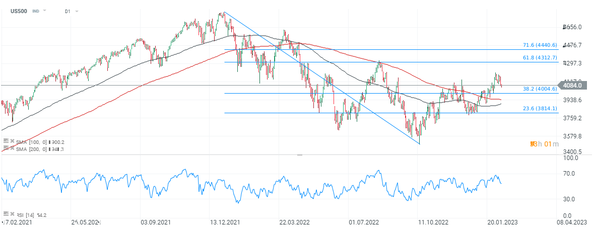 Gráfico US500, intervalo D1. La creciente fortaleza de la oferta puede sugerir una próxima prueba de 4000 puntos ubicados cerca del retroceso de Fibonacci de 38.2 de la onda descendente que comenzó en diciembre de 2021. En ausencia de una disminución dinámica, los promedios SMA100 (línea negra) y SMA200 (línea roja), si mantienen el impulso actual, probablemente se cruzarán para formar una formación alcista de 'cruz dorada'. Fuente: xStation5
