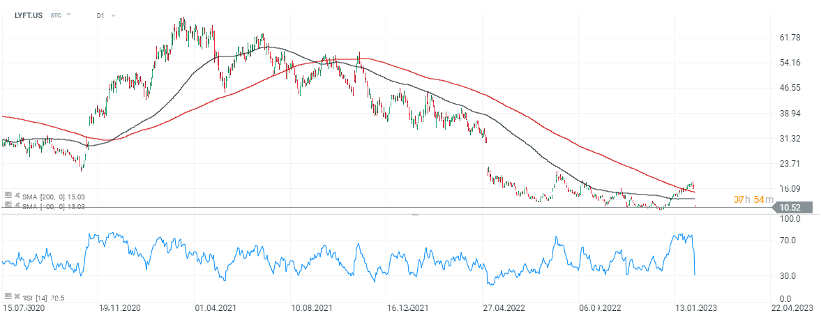 Acciones de Lyft (LYFT.US), intervalo D1. La acción abrió hoy con una enorme brecha a la baja y el RSI se enfrió a 30 puntos. La acción no pudo mantenerse por encima de la SMA200 y volvió a entrar en la tendencia bajista. Sin embargo, desde la proximidad de los 10,5 dólares, puede haber un rebote contrario a la tendencia, ya que la empresa vuelve a cotizar cerca de los mínimos históricos (diciembre de 2022). Fuente: xStation5