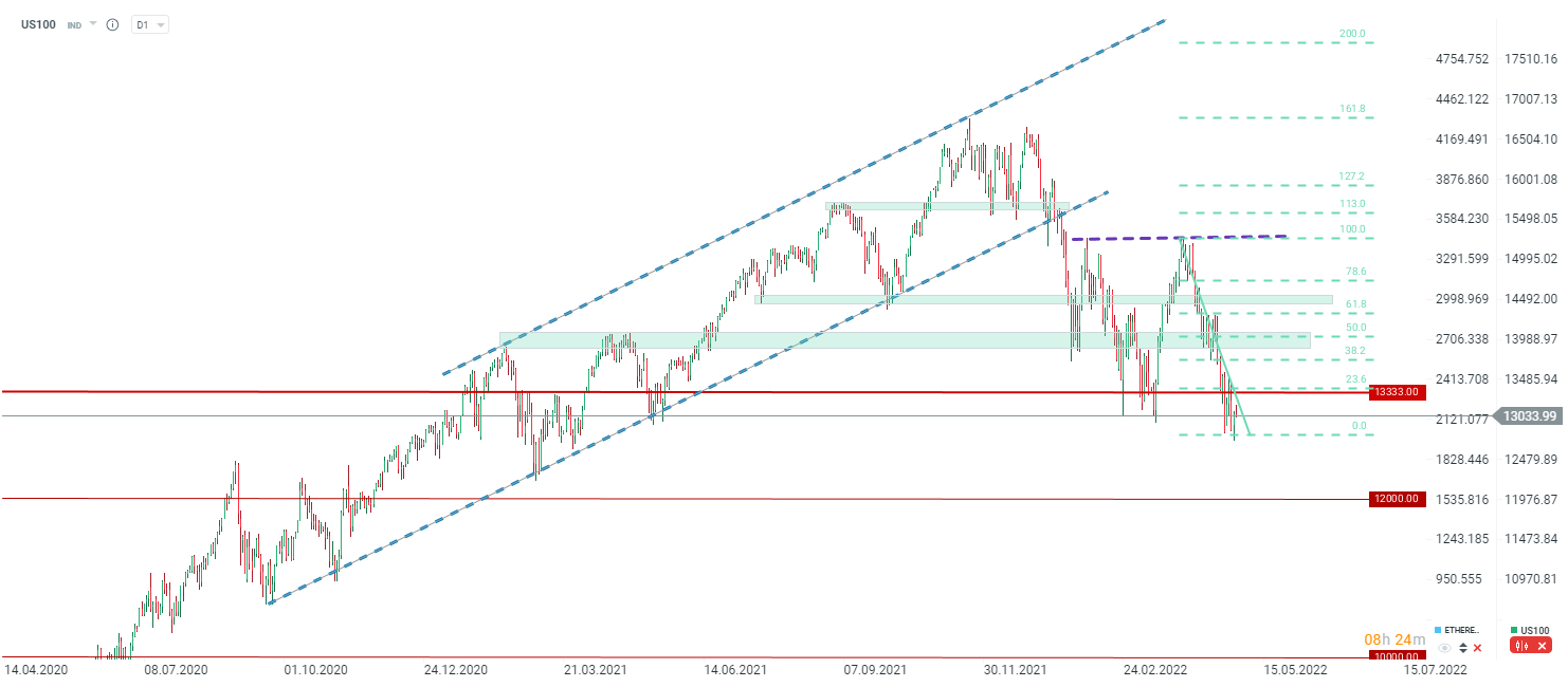 US100 logró volver por encima de 13000 puntos. Sin embargo, se necesita una rentabilidad por encima de los 13300 puntos para iniciar una mayor recuperación en Wall Street. Por otro lado, una caída por debajo de 12800 podría abrir el camino a la zona 12000-12400. Fuente: xStation5