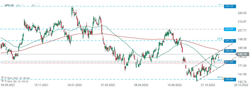 Las acciones de United Parcel Service (UPS.US) lanzaron la sesión de hoy al alza y se acercan a una resistencia importante alrededor de $186,80, que coincide con el límite superior del canal ascendente local y la media simple de 200 (línea roja). Fuente: xStation5