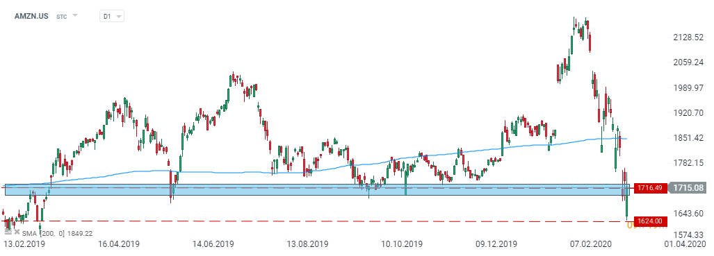 Amazon.com (AMZN.US) : el precio está probando un fuerte nivel de soporte en $ 1716.49. Si persiste el sesgo positivo, el precio de la acción podría moverse hacia 200MA (marcado en azul). Fuente: xStation5