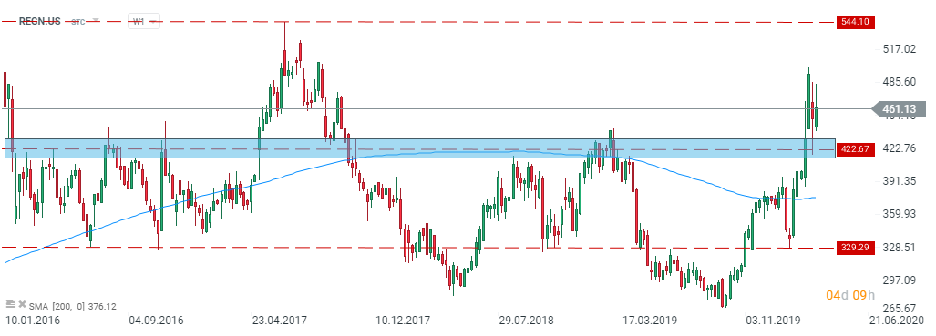 Regeneron Pharmaceuticals (REGN.US) cotiza por encima del nivel de soporte principal a $ 422.67 basado en noticias positivas sobre la posible vacuna contra el coronavirus. El precio podría probar el nivel de resistencia local en $ 544.10. Fuente: xStation5