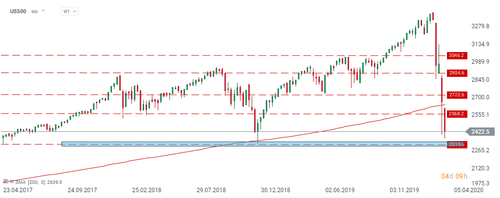 S&P500 (US500) rompió por debajo del nivel 2568.2 y tiene como objetivo probar la próxima zona de soporte principal ubicada en 2319.6. Fuente: xStation5