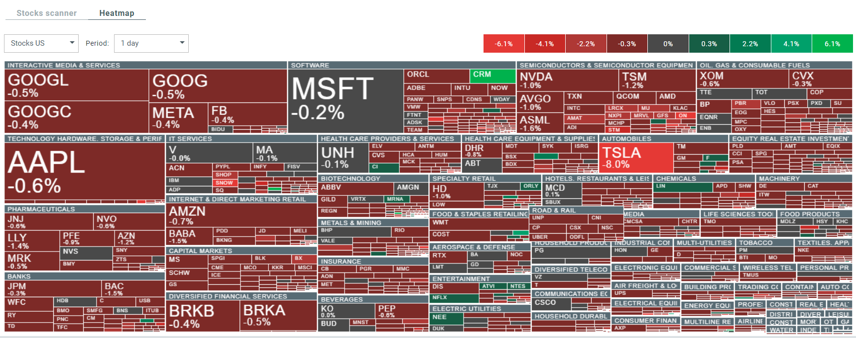 Acciones del índice S&P 500 clasificadas por sectores e industrias. El tamaño representa la capitalización de mercado. Fuente: xStation5