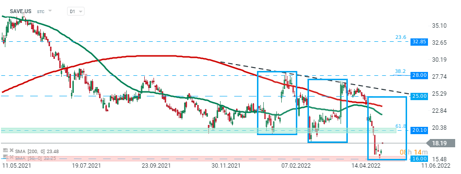 Las acciones de Spirit Airlines (SAVE.US) iniciaron la sesión de hoy con una brecha de precios alcista y, si prevalece el sentimiento actual, la resistencia de $20,10, que coincide con el retroceso de Fibonacci del 61,8 % de la ola alcista iniciada en marzo de 2020, puede estar en riesgo. Por otro lado, si los vendedores logran recuperar el control, entonces se puede iniciar otro impulso a la baja hacia los mínimos recientes alrededor de $ 16.00. Fuente: xStation5