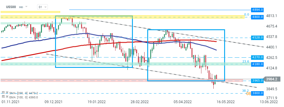 El viernes, US500 logró regresar por encima del nivel de 3965 pts, que está marcado con el límite inferior de la estructura 1:1 y el límite inferior del canal descendente. Sin embargo, los vendedores se vuelven más activos hoy y el índice se acerca nuevamente al nivel mencionado. En caso de que se produzca una ruptura a la baja, el próximo objetivo para los bajistas se ubica alrededor del área de 3800 pts, que coincide con un retroceso del 38,2% de la ola alcista iniciada en marzo de 2020. Sin embargo, si los compradores logran defenderse de los vendedores nuevamente, entonces otro movimiento alcista hacia la resistencia en 4180 pts. Fuente: xStation5