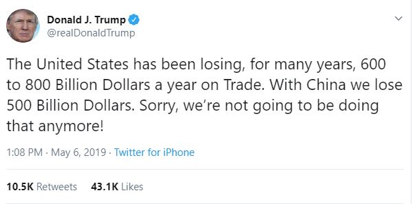Donald Trump conmocionó al mundo durante el fin de semana ya que amenazó con imponer un arancel del 25% a todos los productos chinos que fluyen a los Estados Unidos. Tales amenazas se producen después de meses de negociar un acuerdo comercial y después de numerosos lemas de "progress is being made". Hoy nos ofrecieron otro tweet que mostraba que definitivamente no está retrocediendo (vea la imagen de arriba). Las consecuencias de reavivar la guerra comercial pueden ser devastadoras para la economía mundial y, desafortunadamente, China ya tomó medidas. Si bien aún no se impusieron tarifas de represalia, el viaje de esta semana a los Estados Unidos se eliminó del calendario del viceprimer ministro Liu He, negociador comercial clave para China. Dicho esto, parece probable que no se produzcan avances en el futuro (se rumoró que la ronda final de conversaciones tendrá lugar esta semana). Para los mercados, la clave es si China toma represalias o no, y si lo hace, puede surgir más presión.aquí .